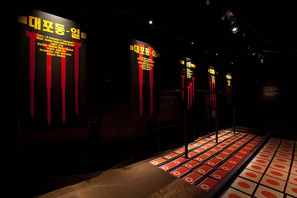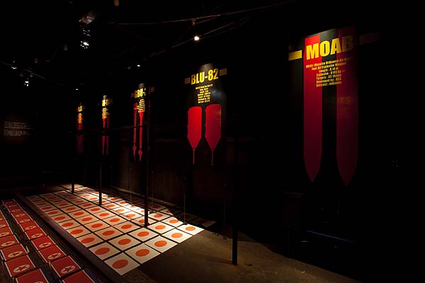 2011年制作: 鉄、カッティングシート、アメリカと北朝鮮の兵器のデータ、黒板、チョーク、他 ナショナリズムに対して、パトリオシズムという言葉があります。 国家を基調とするナショナリズムの愛国心に対して、郷土や人を基調とした愛国心 としてのパトリオシズムは郷土愛と訳される。兵器は本来は人や人々の生活を守る ために作られたものだが、現在では人ではなく、国家やシステムそれ自体を守る ために機能してはいないか? そうした現実に疑問を投げかけるための作品です。 是非、中央の平均台を歩き、奥の黒板に書かれた作家のメッセージをご覧下さい。